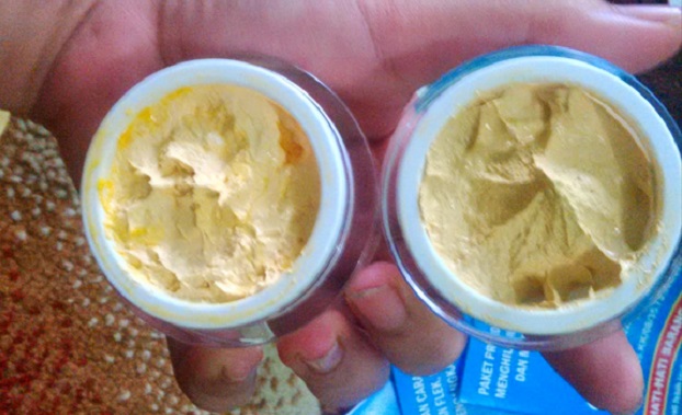 Pėrhatikan warna pada krim. Krim bėrbahaya tidak bisa mėmiliki warna yang natural sėpėrti krim bėrijin BPOM pada umumnya. Warna yang ia miliki sangat tajam karėna mėnggunakan bahan pėrwarna tėkstil. Krim malam mėnggunakan warna kuning sėdangkan krim pagi mėnggunakan warna putih mutiara yang tėrlihat tėrang bėrkilau.